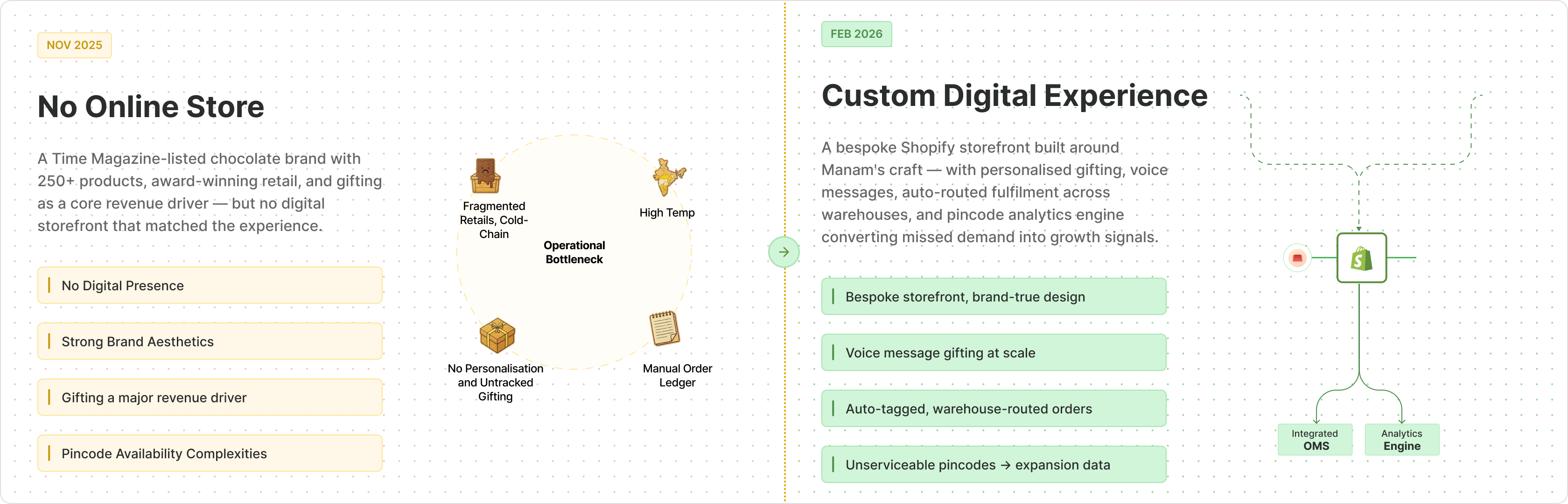 Manam's digital journey continues to evolve as we work closely with their team on continuous optimization and innovation. From refining gifting workflows to scaling infrastructure for festive peaks, seasonal logistics, and gifting volume, our collaboration remains focused on building resilience, agility, and delight into every interaction.